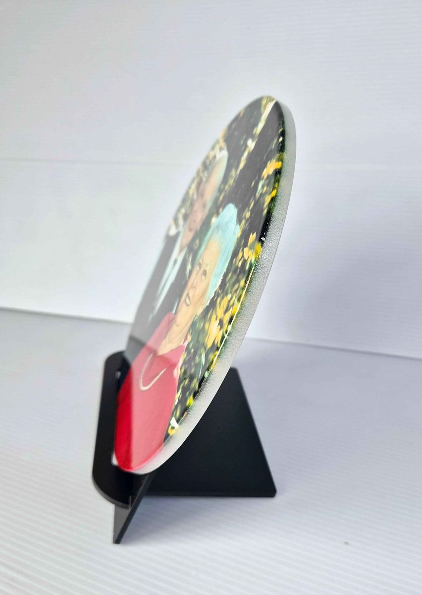 Our 20cm Round Ceramic photo display is perfect for displaying those special memories. We can also add text to these. It has a cork backing so can be displayed either laying down or we have custom made a display stand to go with them, so they stand up for easy display.