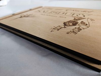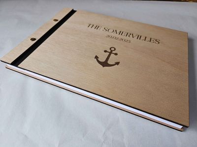 Features: Wood cover, Presentation grade pages, Brass Rivets, Flexible hinge, 50 pages.