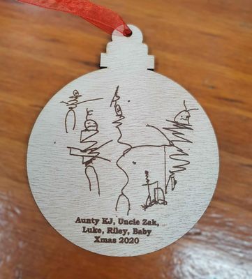Send us a picture of your child's hand drawn masterpiece and we will turn it into an engraved wooden bauble for you.